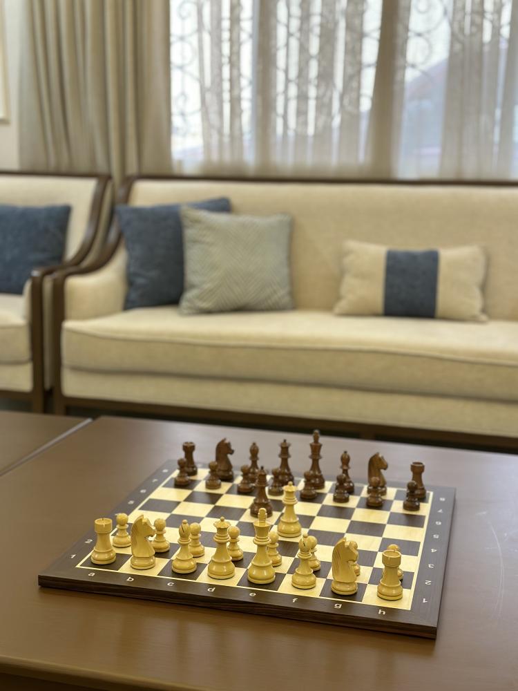 الرقعة: صنعت رقعة الشطرنج الخشبية من خشب الأبنوس والقيقب+MDF يبلغ سمك هذه الرقعة 1.5CM وقياسها 52*52